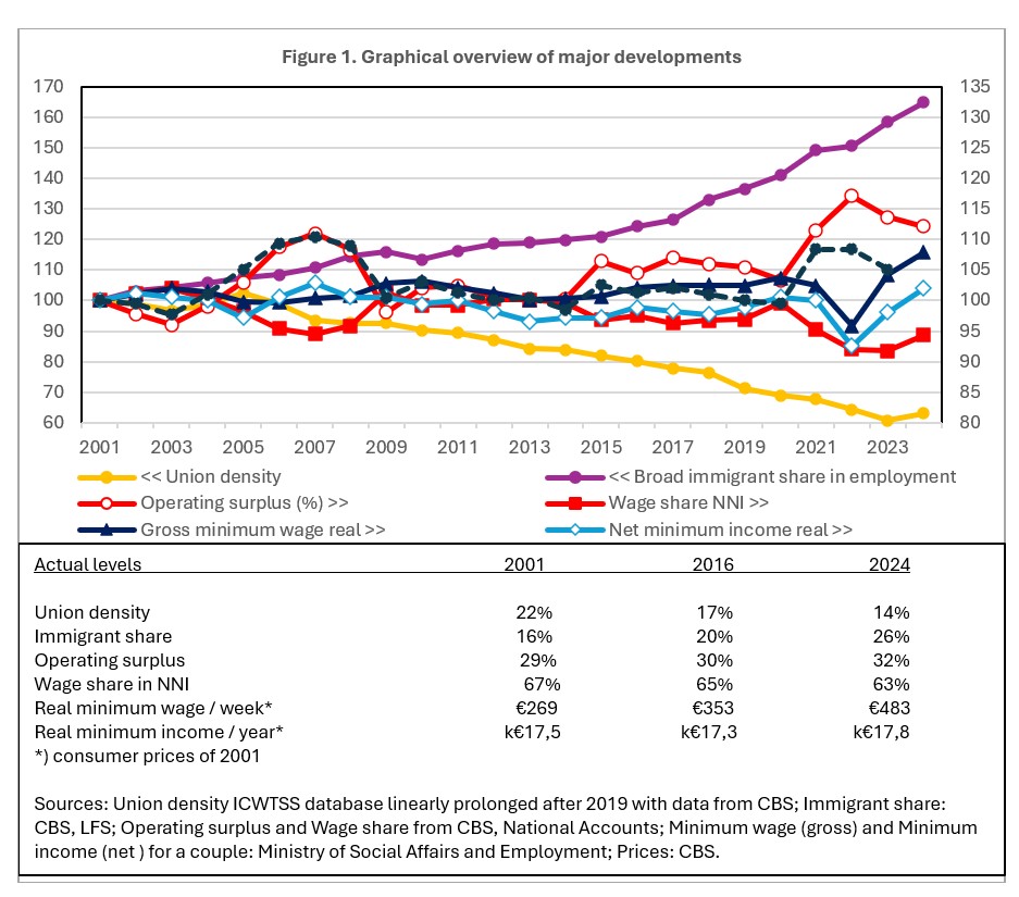 The neoliberal ideology that came up in the 1980’s, with a strong belief in markets rather than government regulation, inspired dramatic institutional changes, of which the full effects have become clearly visible in the first quarter of the present century. Two main changes stand out: the power balance among employers and workers shifted drastically toward employers and labor lost the backing of the central government: the embedding of the labor market in social security was drastically reformed and the statutory minimum wage was lowered and frozen on several occasions. This has gone hand in hand with a growing fracturing of the labor force along dimensions of immigration, wages, educational attainment and the allocation of employment over households and their members. This has complicated policy making and contributed to the shifting of power away from unions to employers.