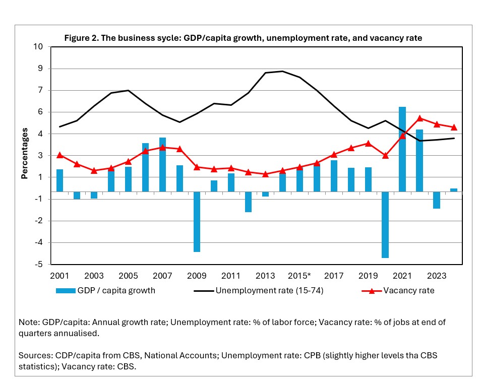 In most recent years the Dutch economy and labor market have very quickly revived after the pandemic. They are now firing on very important cylinders: the highest international trade surplus ever, about the lowest government debt in 45 years, the highest employment rate and population size ever – based almost entirely on net immigration since 2016 – accompanied by shifts from flexible to permanent contracts, growth of full-time jobs, and a remarkably high vacancy rate, but at the same time also the lowest wage share as well as relatively low wage inequality and a modest low-wage employment share. And, in addition, surprisingly stagnating GDP and productivity growth in 2023 and 2024.