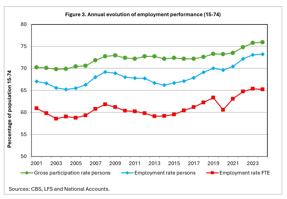 The population of the Netherlands has grown strongly (by immigration) and employment rates have increased substantially. The population grew from 16 million in 2001 via 17 million in 2016 to almost 18 million in 2024, at an annual growth rate that accelerated from 0.43% up to 2016 to 0.79% thereafter. The working-age population (15−74 years) grew similarly by 0.47% and 0.68% respectively and the labor force by 0.68% and 1.45% respectively. Overall, the employment head-count increased at a faster rate, going from 8.4 to 9.8 million, but more slowly until 2016 (0.48%) and four times faster since then (1.96%). These developments have lifted the gross participation rate from 70.2% to 75.9%, and the employment rate from 67.0% to 73.2% (Figure 3). All this regards a head count of persons aged 15 to 74, but note that ages 15 to 64 score a significantly higher employment rate of 82.3%, which is often shown in international comparisons (e.g. Eurostat). The employment volume, which is measured by the count of total hours worked, grew less at first (0.38%) but more than five times faster after that (1.97%). Hence, average annual hours worked per worker vary only moderately from 1451 (2001) to 1422 (2012) and 1457 (2019) to 1434 hours in 2024 (disregarding the year 2020). Hours worked per capita 15-74 first fell from 839 (2001) to 780 (2014) but subsequently rose at an annual growth of 1.26% to 873, which is well above the initial level. Notably, head-count employment hardly fell in the pandemic year of 2020 but hours worked did while, remarkably, hours actually paid hardly changed. We come back to this divergence below when discussing wages.