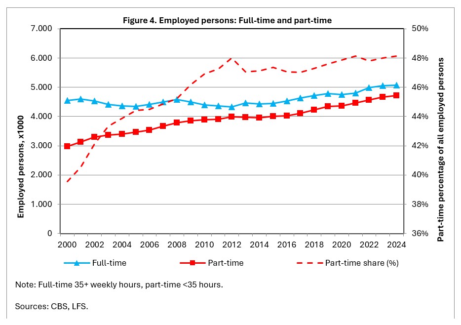 This may be explained from a combination four factors: the individual taxation of incomes from labor instead of at the household level which was introduced in the early 1970s, the traditionally low levels of the Dutch female employment rate until then, the preferences of workers for combining paid work with household care or with participation of education, and last but not least the pressure of employers to optimize labor efforts by cutting slack hours. At the same time, very few part-timers in the Netherlands work so involuntarily (2.2% or 8 times less than EU average – Eurostat (lfsa_eppgai] 2024). However, the international difference is much smaller (3 times) for the share of involuntary parttime among total employment (1.0%) because of the almost fifty-fifty division between full-time and part-time. Evidently, the involuntary share is still less per capita of the working-age population (0.7%) because of the comparatively high employment rate. Interestingly, the latter share rises fourfold from 2001 while full-time employment stagnates and exceeds the EU27 average in 2014 (4.0% to 3.8%). After 2014 it decreases equally strongly, likely because worker preferences for hours of work align better with employment options due the new growth of full-time employment and the faster increase of part-time jobs with the most hours (which is mirrored by the declining share of part-timers desiring longer hours (19% to 11%).