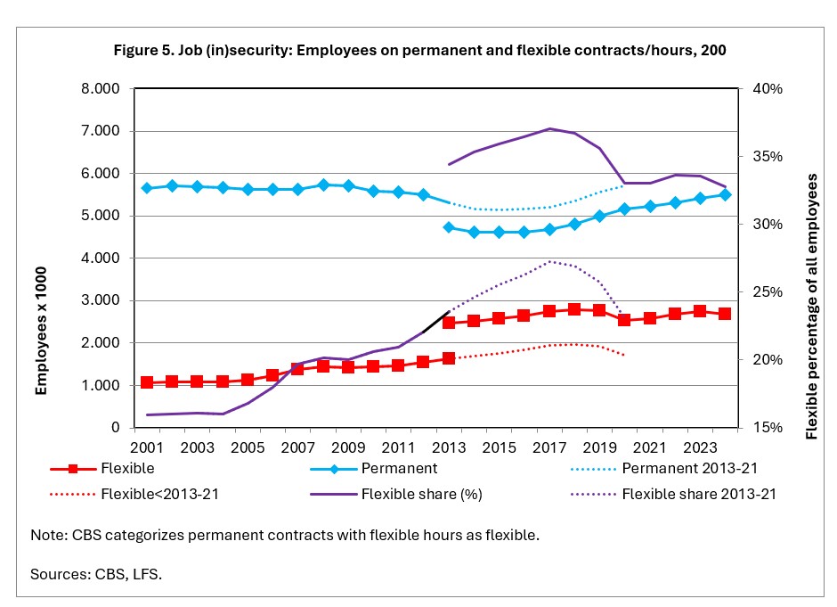 This has made hiring (so-called) self-employed attractive for firms, naturally together with the ease of ending the contract. As of 2025 their hiring instead of an employee will be scrutinized more strongly by the tax authorities, on the assumption that they are employees unless convincingly disproven by the employer. Flexible contracts are obviously attractive for employers. But many individuals are also drawn to these contracts for the greater individual freedom and the higher income in the short run, as they don’t have to contribute to social insurance and pension plans and are taxed less. But there is also clear evidence of employer pressure to push workers into these cheaper contracts.