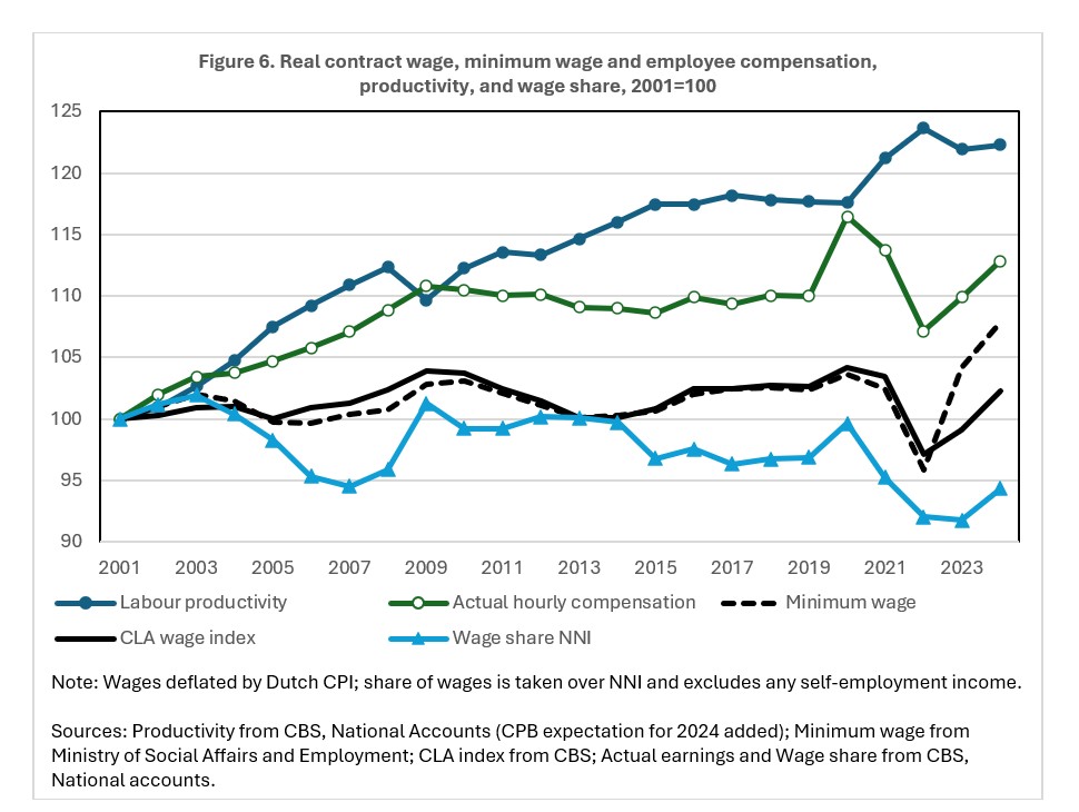 Contract wages lag far behind productivity growth. Actual wages follow more closely, but still have fallen some 10% behind in 2024. Hourly labor productivity had grown by 18% in 2020 and then quickly jumped to 24% in 2022 followed by a slight decline in 2023. This rise exceeds the growth in contractual wages twelvefold and in actual earnings almost twofold.[viii] As consumer prices rose somewhat faster than producer prices, workers lost somewhat less from the point of view of employers. Still, the pure wage share (wages in national income) shows a drop of some 5 percentage points from 2001 to 2024. It never really exceeded its 2001 level (67%) and had fallen to 61% in 2023, well below 64% at the time of the Financial Crisis, before it recovered somewhat to 63% in 2024. The zero-difference between productivity and the actual wage for the year 2020, as in 2001, apparently does not correct for the generous government support mentioned above. The Dutch adjusted labor share (AIQ) is another key institutional statistic, which at a certain threshold legally allows the government to prevent the regular uprating of minimum wage and benefits. The AIQ is calculated for the private sector and tops wages up idiosyncratically with total self-employed earnings by way of an attributed income from labor. It has followed almost the same pattern as the pure wage share albeit at a higher level, declining from 74% in 2001 via 68% in 2007 and 72% in 2016 to 68% in 2022-2024, except that it keeps the current level equal to the Financial Crisis – which likely mirrors the significant growth of self-employment.